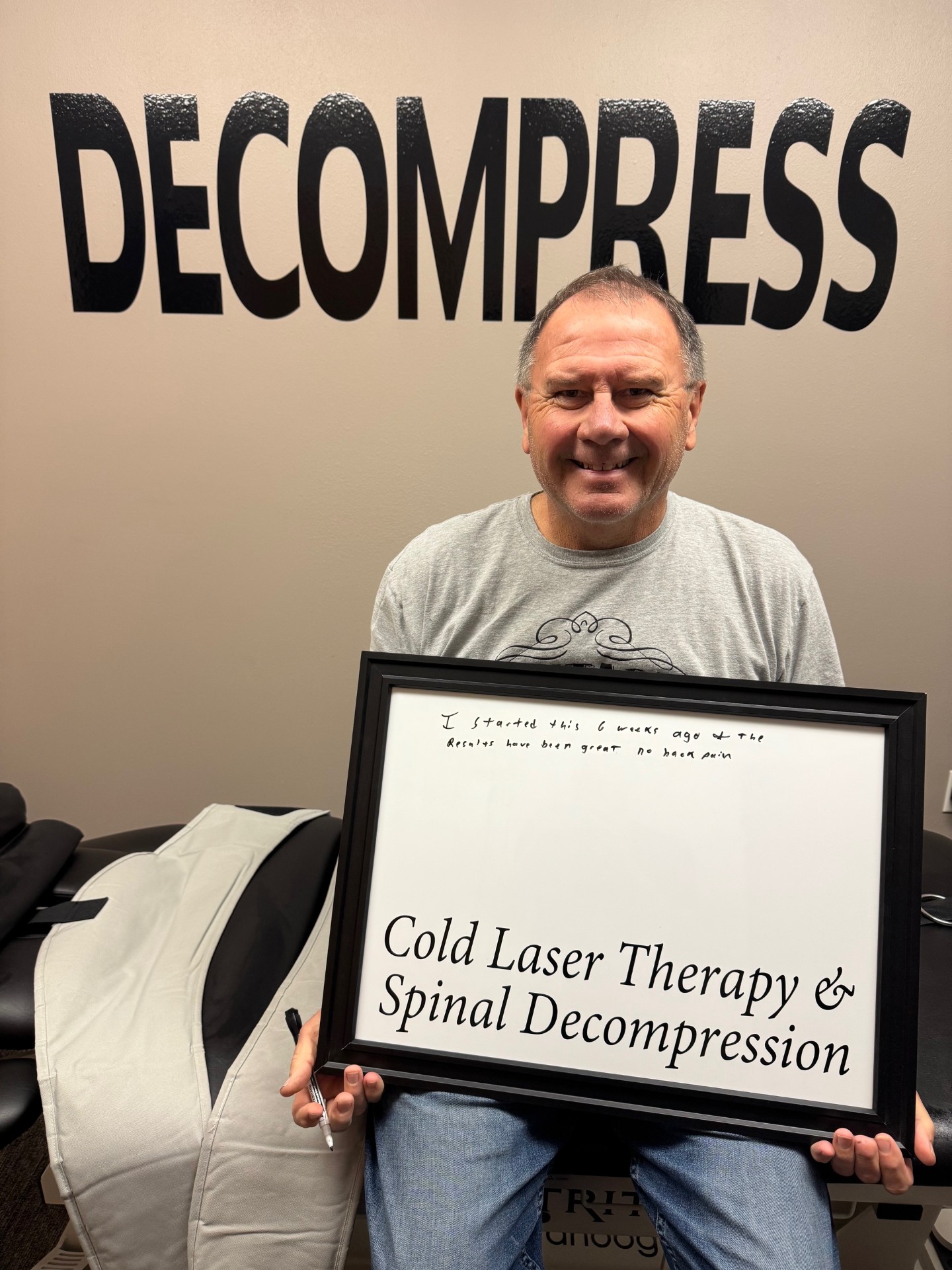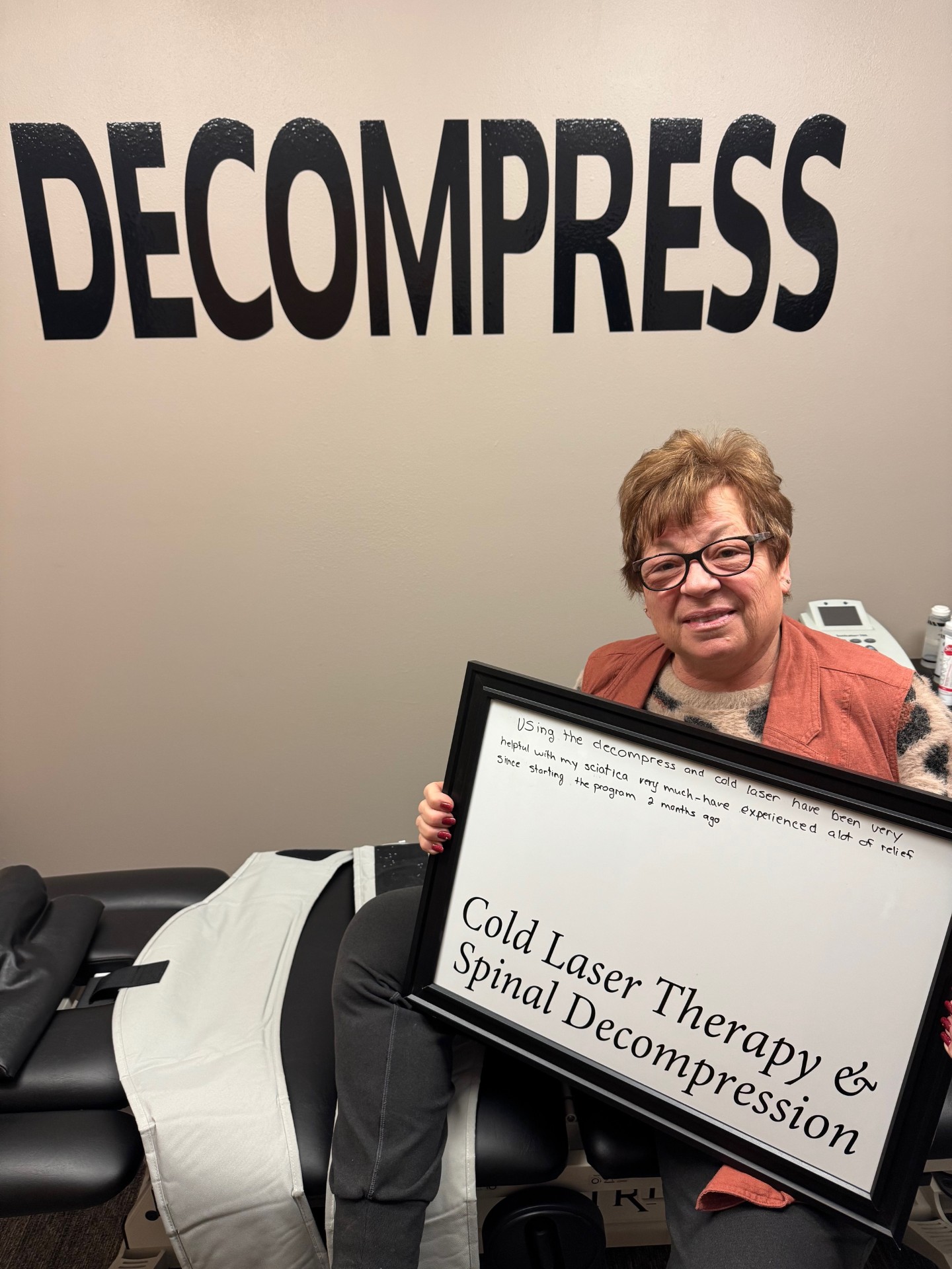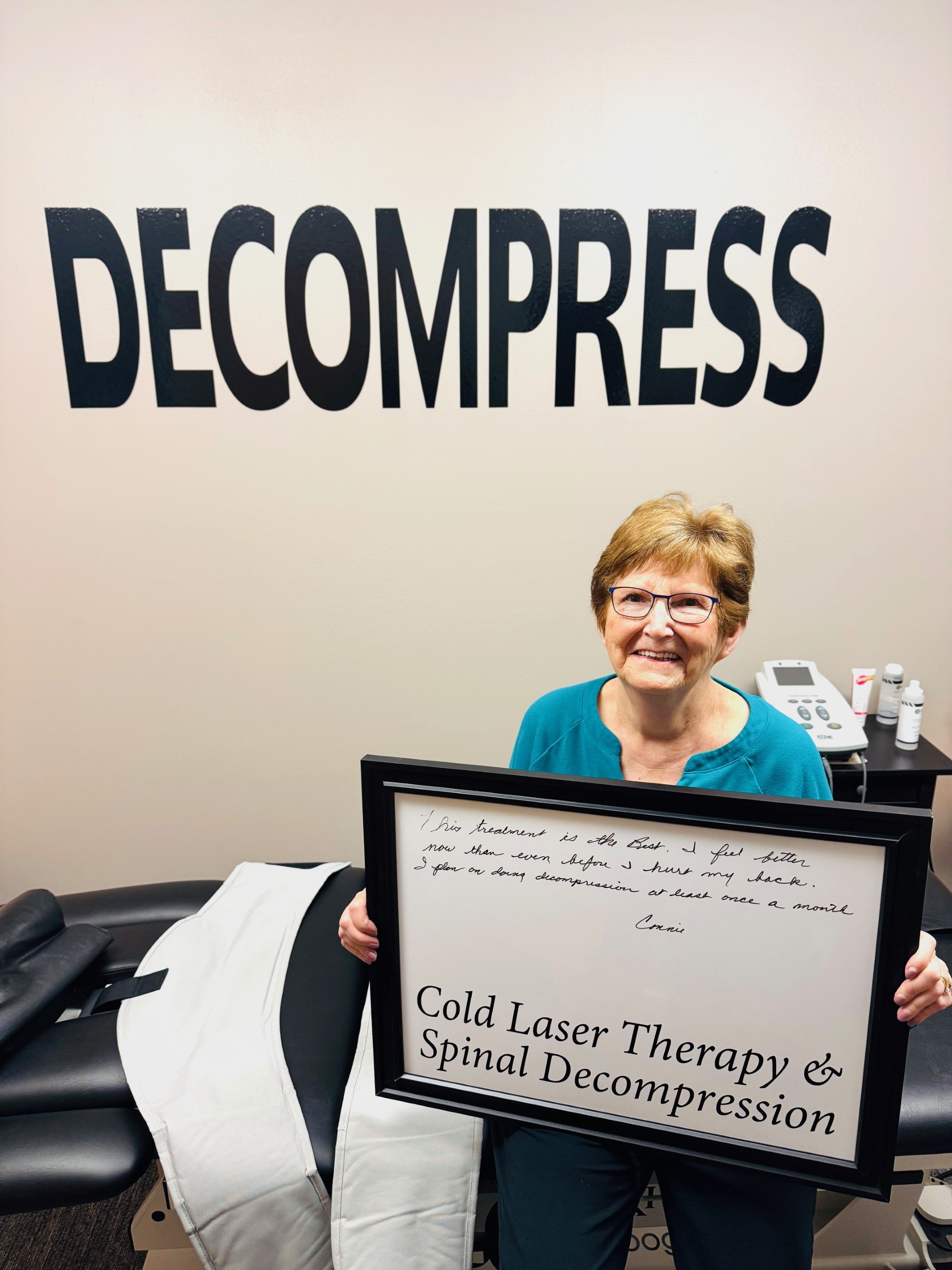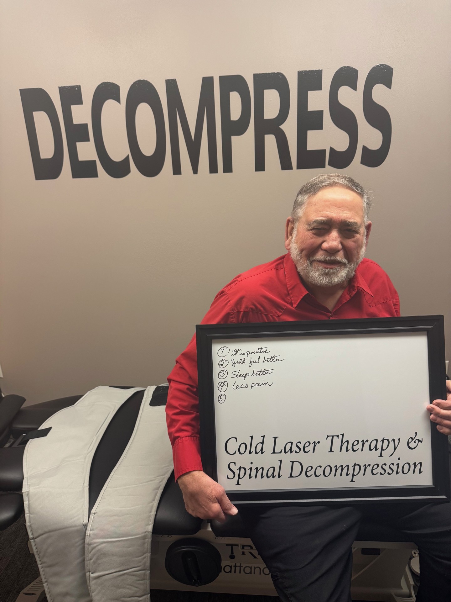 The gentle distractive forces of the Spinal Decompression create a decompression of the spine with unloading due to distraction and proper positioning, to improve blood flow and nutrient exchange to the injured area. You'll experience several cycles of stretch and relaxation, which graduate to a peak over a period of several minutes.