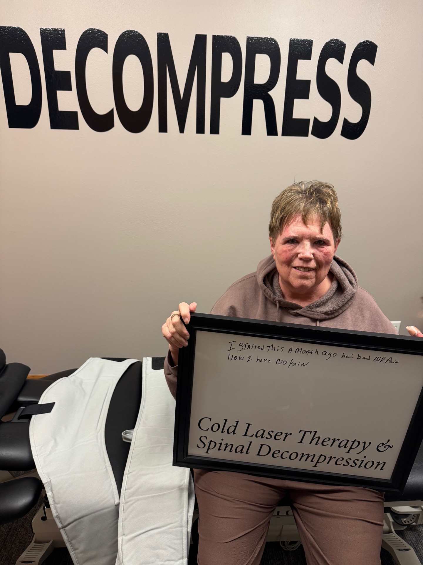 The gentle distractive forces of the Spinal Decompression create a decompression of the spine with unloading due to distraction and proper positioning, to improve blood flow and nutrient exchange to the injured area. You'll experience several cycles of stretch and relaxation, which graduate to a peak over a period of several minutes.